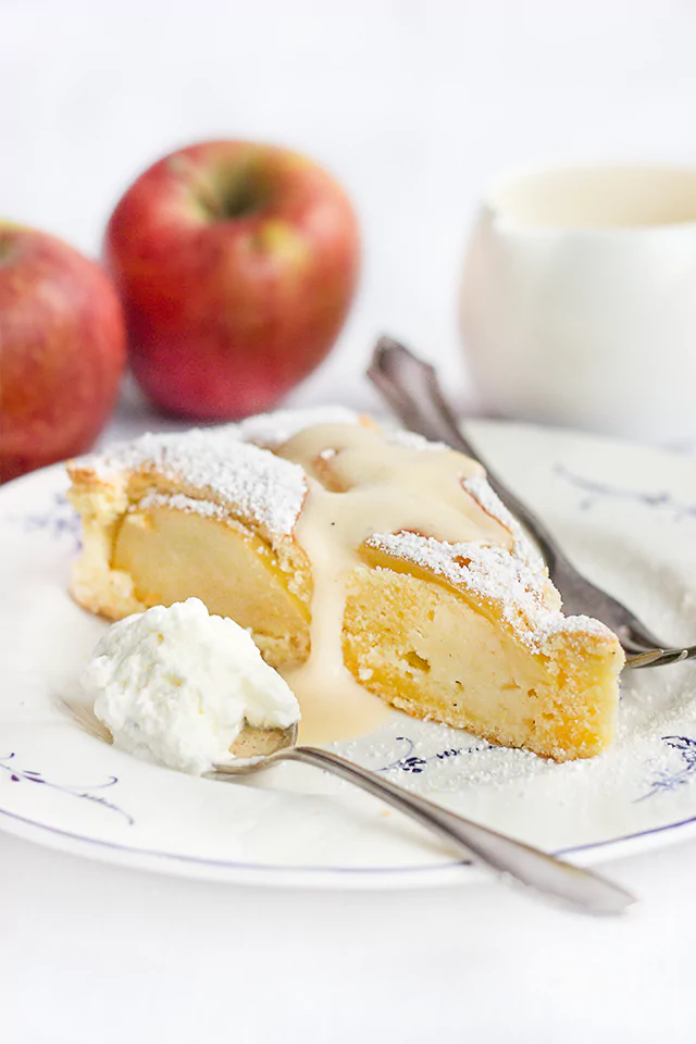 Hello Fran! Glad that you like my recipes! Whenever you are interested in an English recipe, tell me and I’ll translate it for you! I just do it with that one. I add the amount of baking powder and vanilla sugar in grams. A whole packet baking powder weighs 17g (cream of tatar), a packet vanilla sugar 8g. Hope you’ll enjoy it! Would be nice to hear your feedback, if you give the apple cake a try!