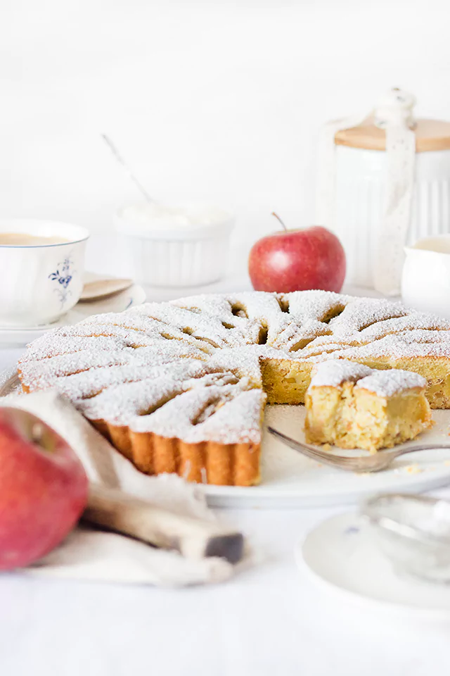 Aber ich möchte euch den Kuchen trotzdem nicht vorenthalten. Man sieht ja immerhin, was es sein soll. Und er ist nunmal auch wirklich lecker. Vor allem die Kombination aus dem Vanillelikör, den Äpfeln und dem leichten Crunch durch die Mandeln finde ich einfach herrlich. Dazu ist das saftige Küchlein sehr einfach und schnell gebacken. Mal wieder ein Kuchen, der alles hat, was ich mag. Und ich hoffe er kann trotz missratender Bilder auch euch ansprechen! Ich versuch mich indessen hier im neuen zu Hause noch Kuchen-Foto-mäßig einzugrooven.