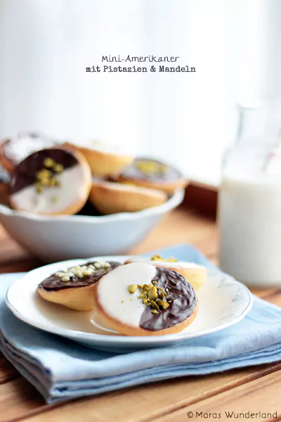 - Beide Glasuren auf die Amerikaner streichen, mit Mandeln und Pistazien bestreuen und trocknen lassen.