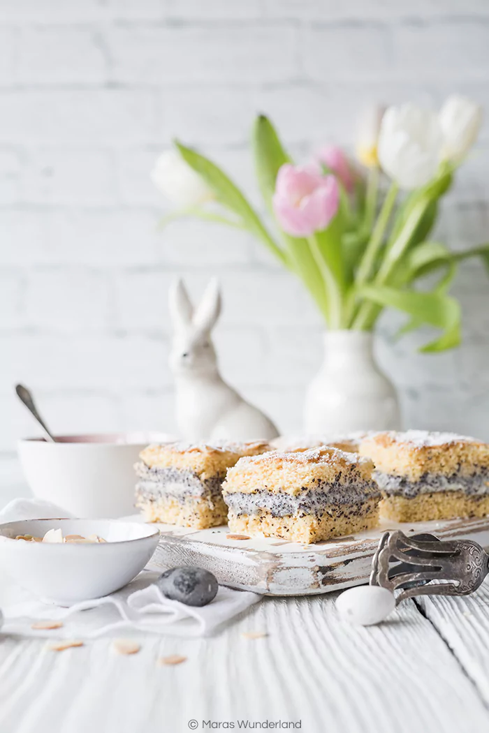 Rezept für einen deutschen Klassiker on der Oster-Variante: Mohn-Bienenstich. Lecker, saftig und gut vorzubereiten.