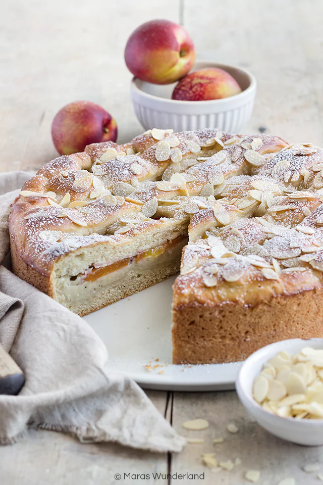 Natürlich kann man hier sicherlich auch Pfirsiche benutzen. Ich bin jedoch nicht ganz so der große Fan von der pelzigen Haut. Da mag ich die Nektarine lieber. Die ist auch knackiger. Sollen es bei mir Pfirsichen sein, dann wähle ich meist Tellerpfirsiche. Auch die funktionieren bestimmt wunderbar in diesem Kuchen. Und falls es doch lieber Beeren sein sollen: na gut, dann halt wieder Beeren.