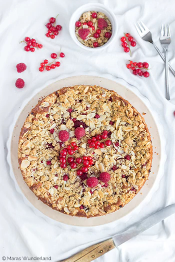 - Für die Streusel alle Zutaten in eine Schüssel geben und zu sandigen Streuseln kneten. Mandelblättchen kurz darunter mischen. Kühl stellen. Johannisbeeren waschen und von den Rispen entfernen. Himbeeren ebenfalls waschen.