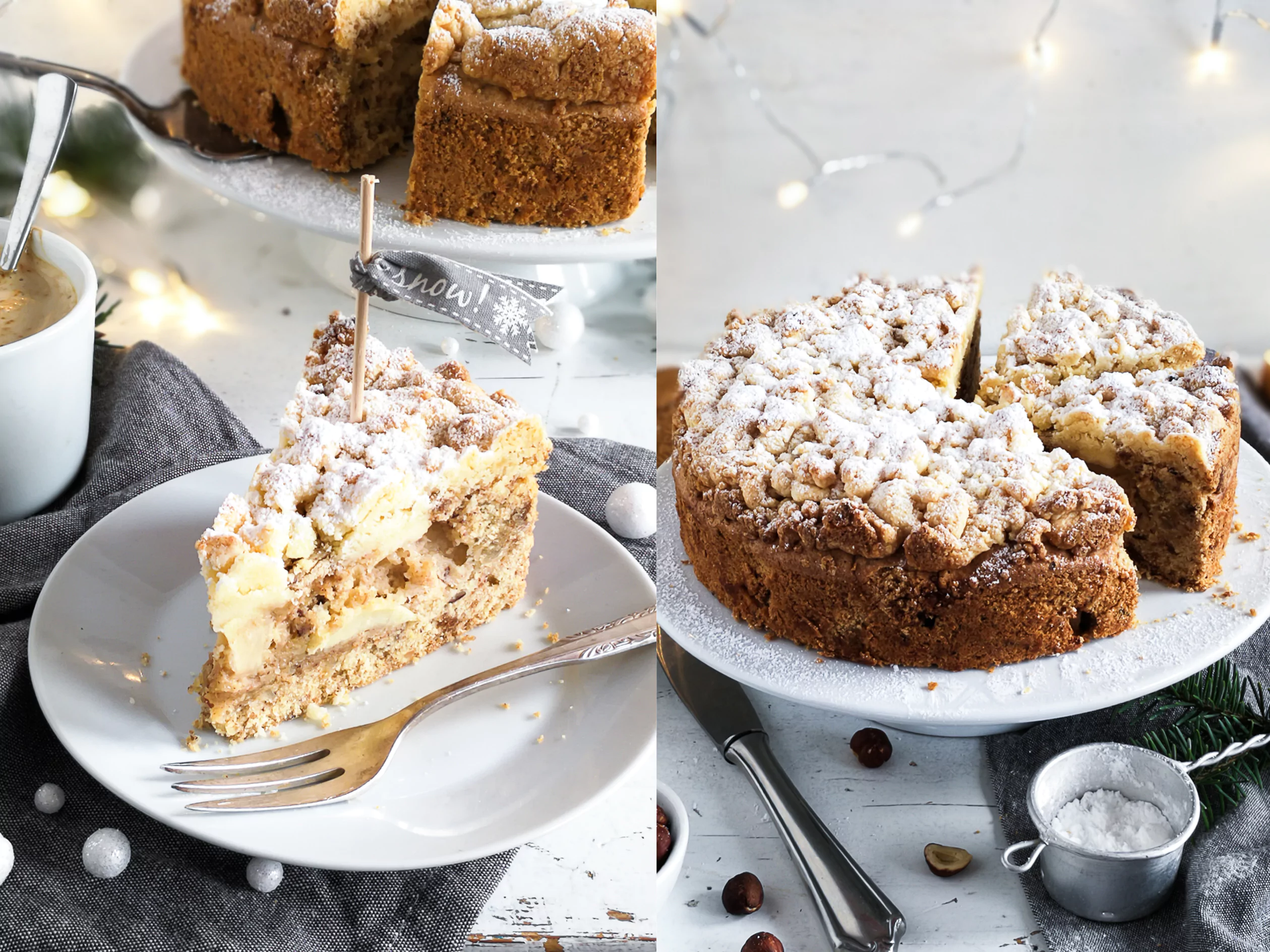 Ein Winter Wunderland Apfelkuchen, mit Spekulatius, Haselnusskernen und Marzipan Streuseln. Perfekt für die kalte Jahreszeit.